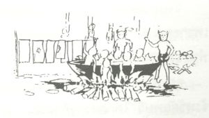 พอเขาจะผลักนักโทษลงกระทะจะเอาผ้าออกพาดราวไว้ มีเชือกขึงไว้สำหรับตากผ้า สังเกตดูมีผ้าจีวร มากกว่า ผ้าสีธรรมดา เก่ามาก และขาดมาด้วย