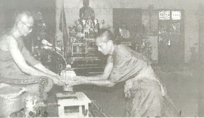 เมื่อพระคุณท่านนั่งลงเรียบร้อย ทุกคนต่างก้มกราบ เสร็จแล้วข้าพเจ้าถือพานพุ่มเข้าถวายสักการะ เมื่อท่านรับแล้ว ข้าพเจ้ากล่าวขึ้นว่า