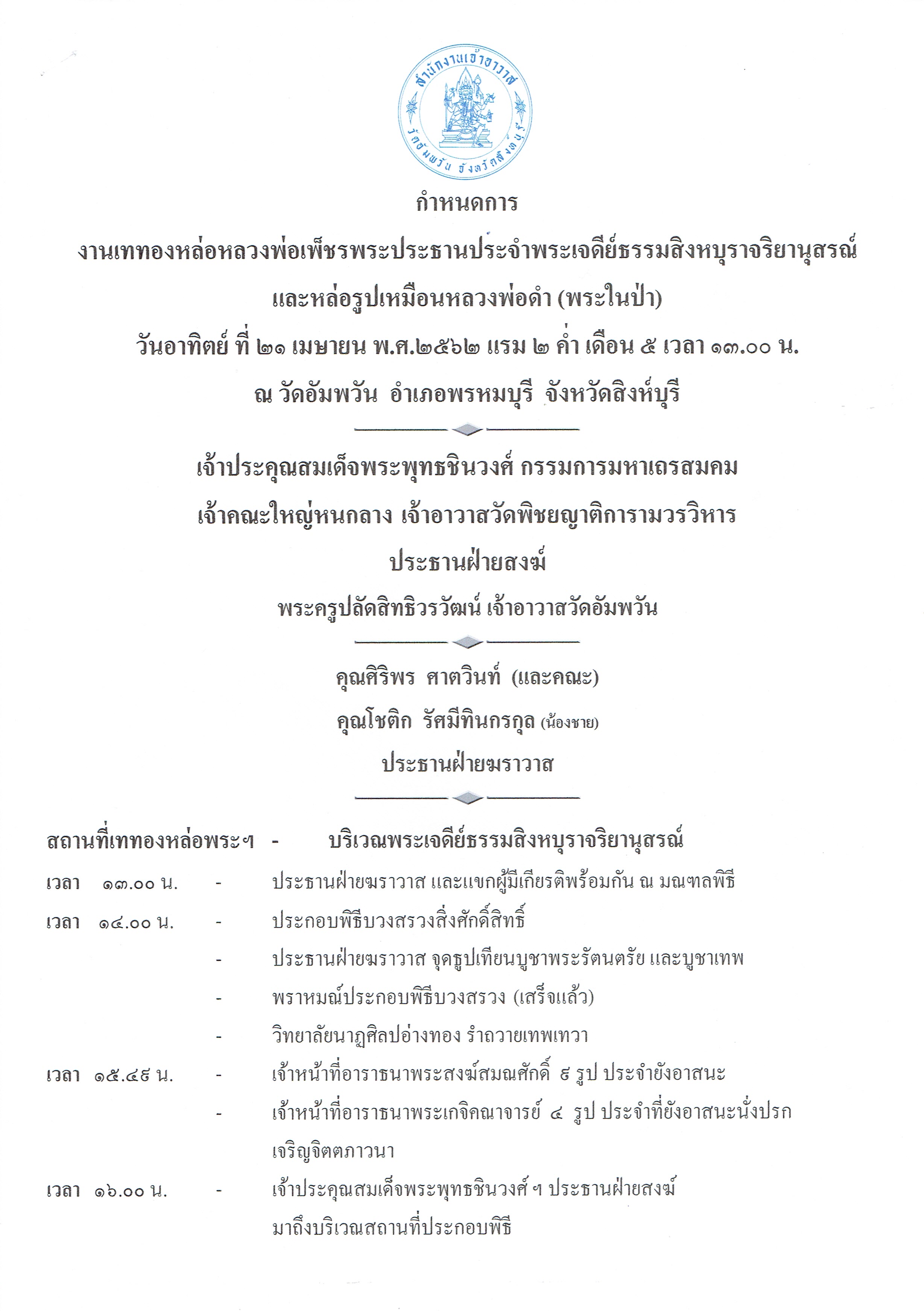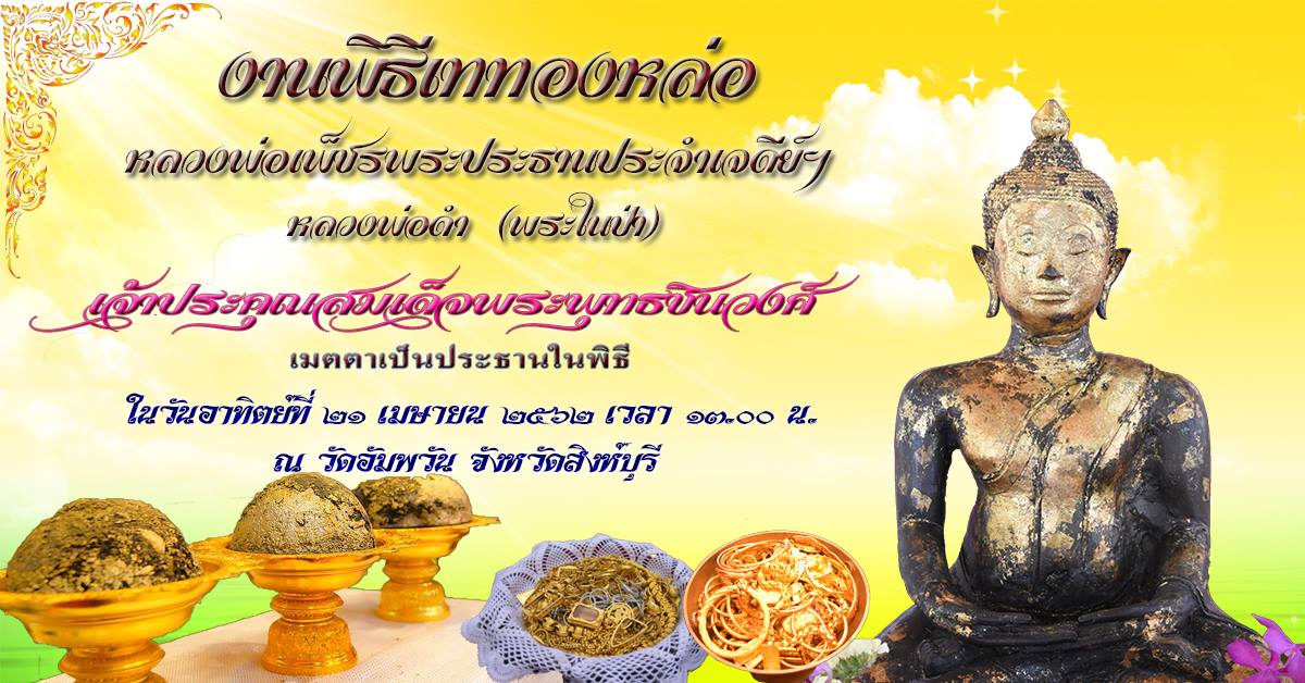 วัดอัมพวัน จังหวัดสิงห์บุรี ขอเรียนเชิญท่านสาธุชน ร่วมอนุโมทนาบุญและร่วมงานในพิธีเททองหล่อหลวงพ่อเพ็ชร เพื่อเป็นพระประธานประจำพระเจดีย์ธรรมสิงหบุราจริยานุสรณ์ และหล่อรูปเหมือนหลวงพ่อดำ (พระในป่า) ในวันอาทิตย์ที่ ๒๑ เมษายน พ.ศ. ๒๕๖๒ ณ บริเวณพระเจดีย์ธรรมสิงหบุราจริยานุสรณ์ วัดอัมพวัน จังหวัดสิงห์บุรี เริ่มพิธีตั้งแต่เวลา ๑๓.๐๐ น. เป็นต้นไป